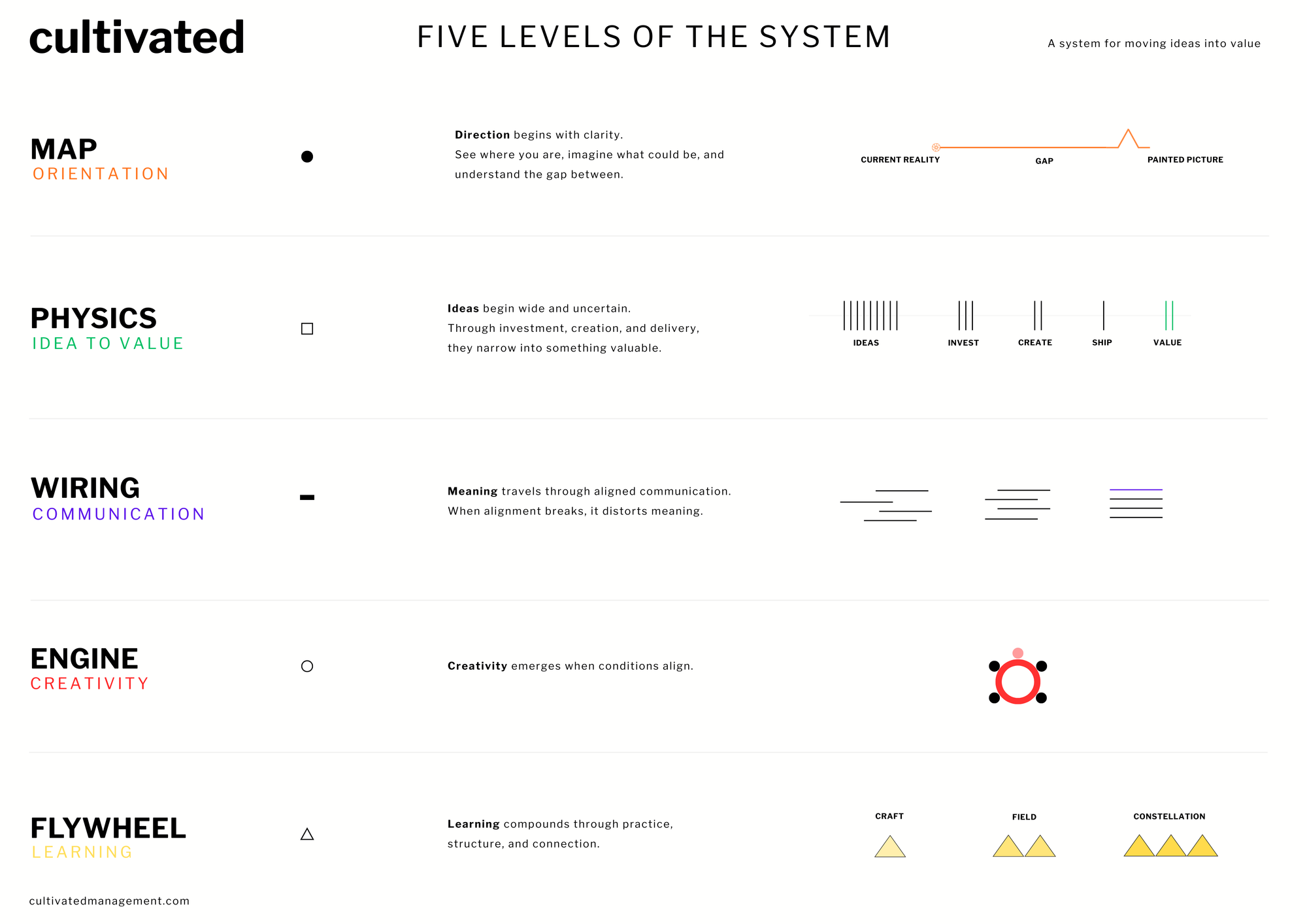 Cultivated explores the space between an idea and real value — and how better direction, systems, communication, creativity and learning help ideas move.